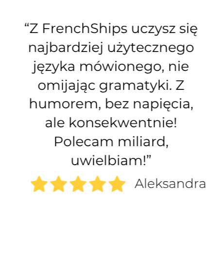 French Ships to przede wszystkim nauka języka, którym będziesz mógł porozumiewać się na co dzień. Nie zależy mi, żebyś znał dużo słów. Moim celem jest, abyś zaczął sprytnie łączyć poznane słowa w logiczną całość. Sam odkryjesz, że język to czysta matematyka. Jest logiczny.